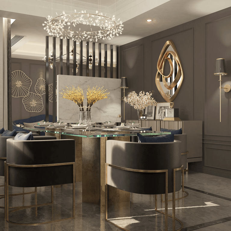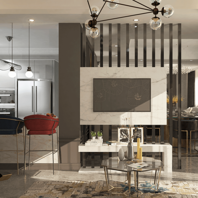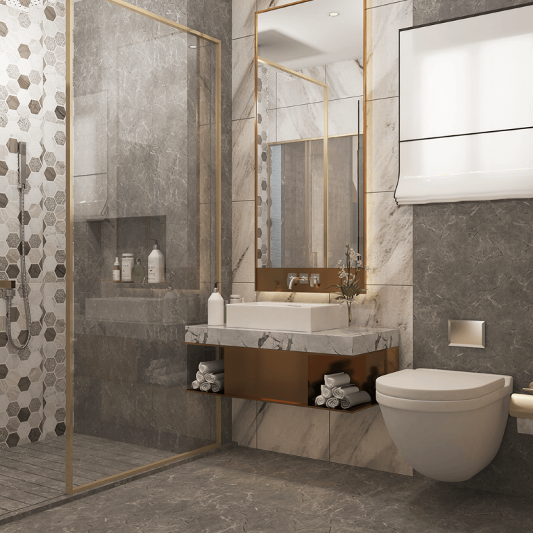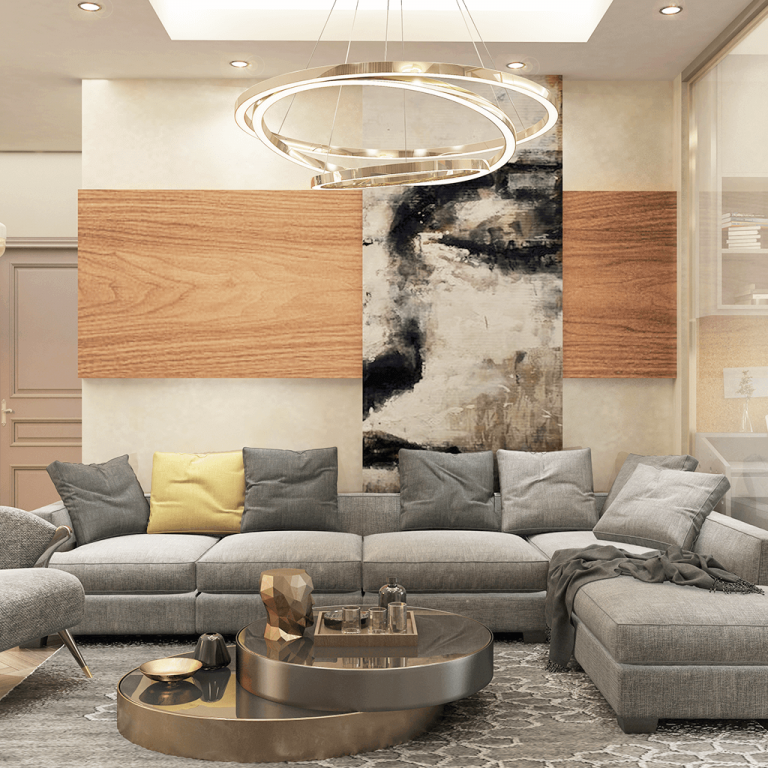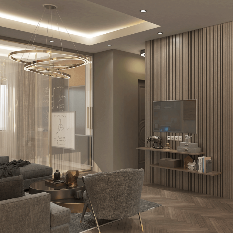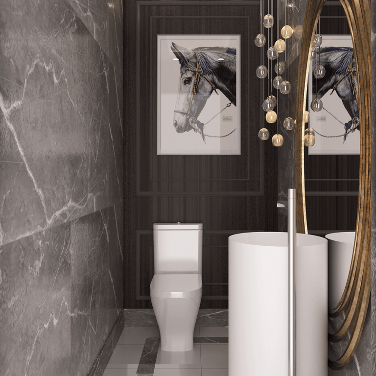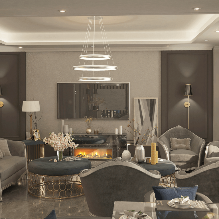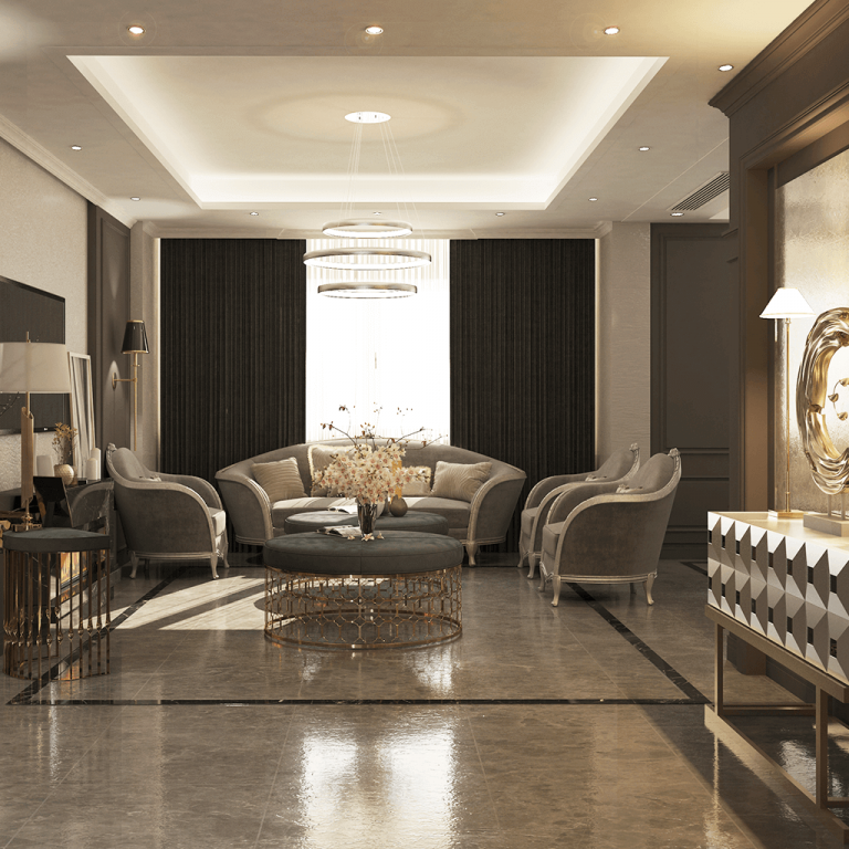 The project here is depending on the use of greys.The shades of grey are subtly broken up by elements in wood.Contrasting touches of black are used to visually balance the design , In addition to the mixture of different materials from marble, wood and shiny glass.