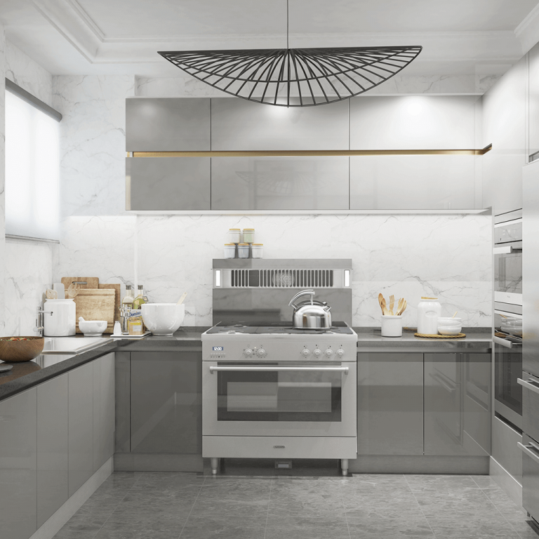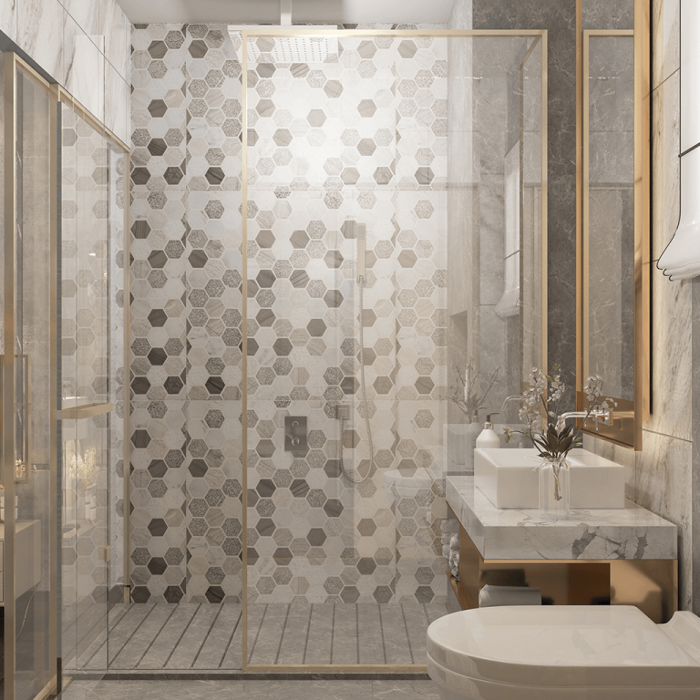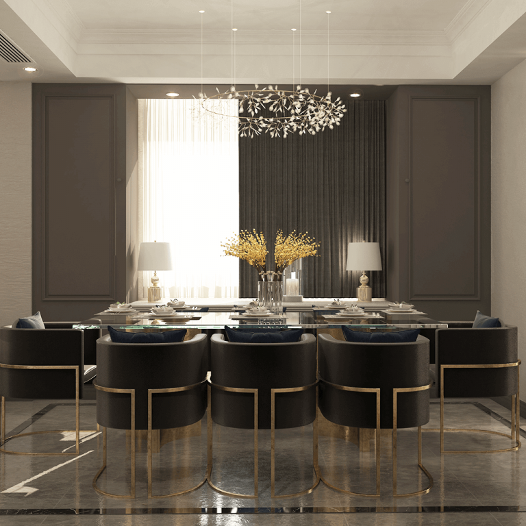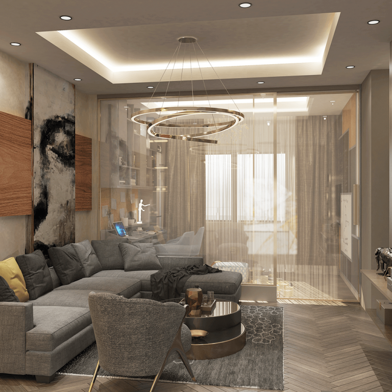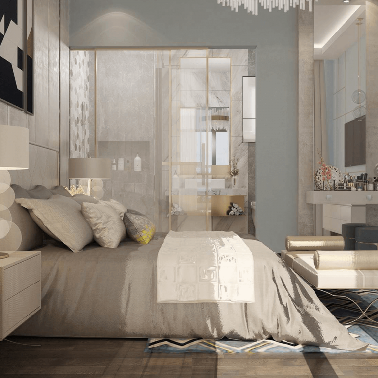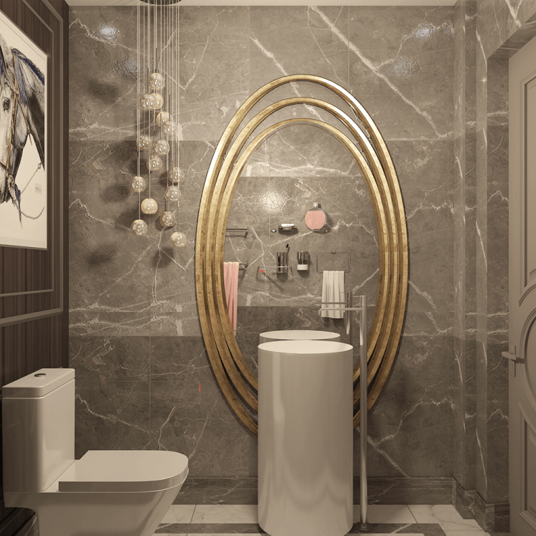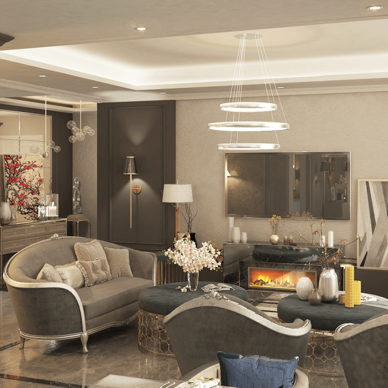The project here is depending on the use of greys.The shades of grey are subtly broken up by elements in wood.Contrasting touches of black are used to visually balance the design , In addition to the mixture of different materials from marble, wood and shiny glass.