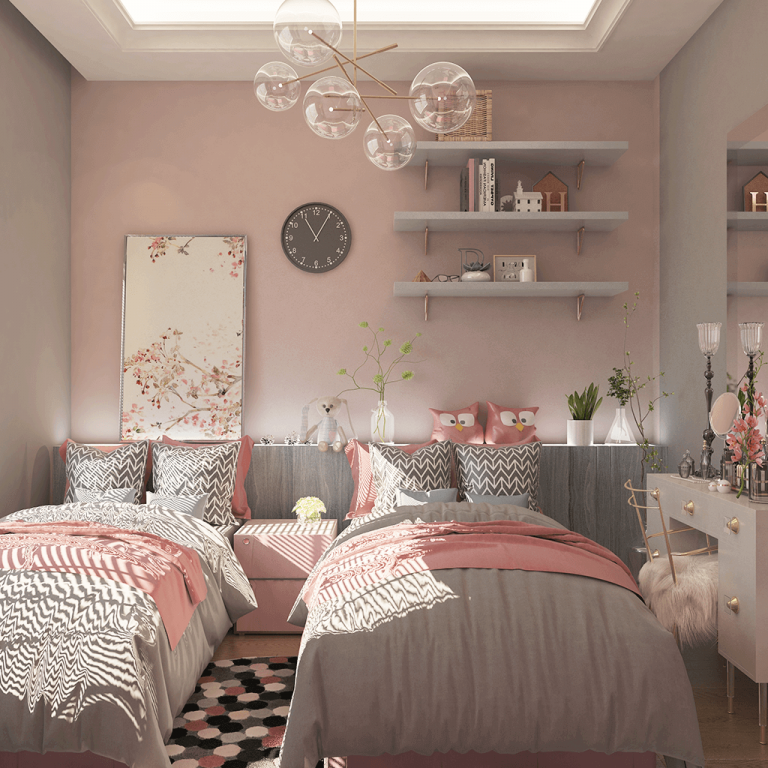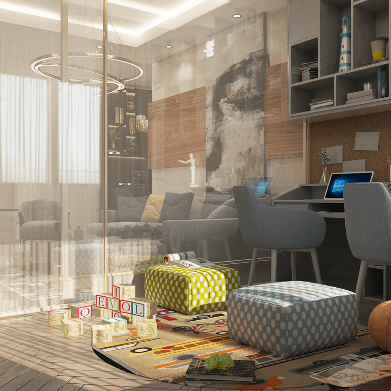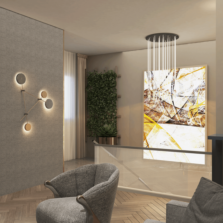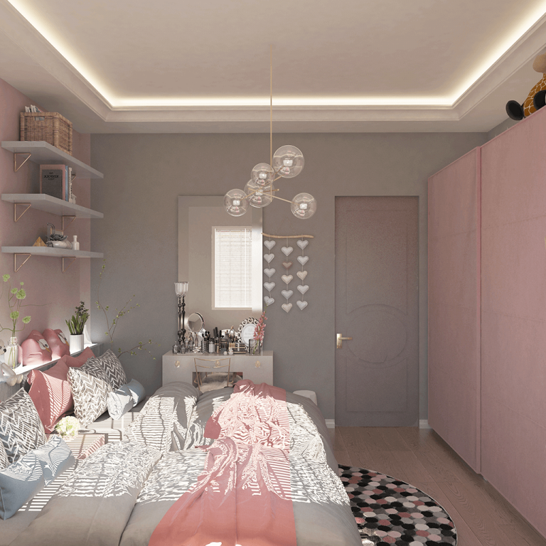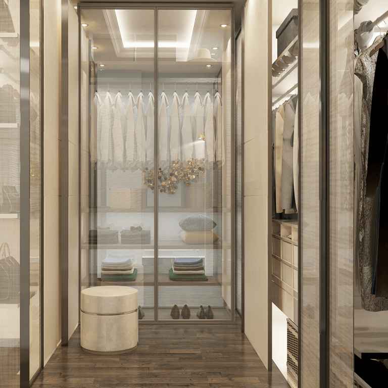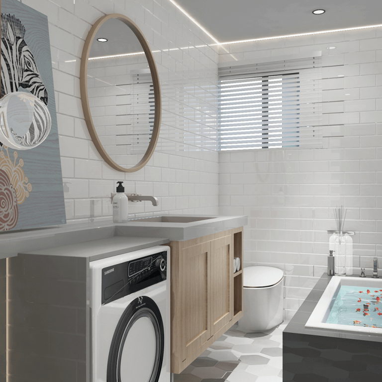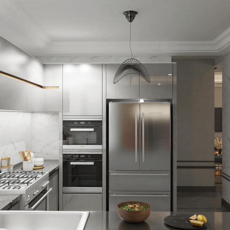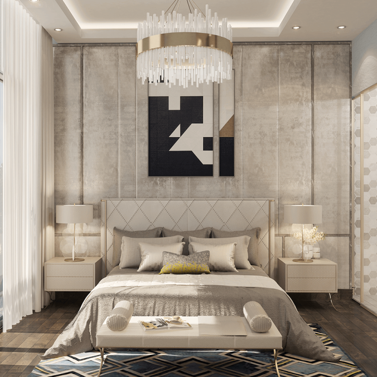 The project here is depending on the use of greys.The shades of grey are subtly broken up by elements in wood.Contrasting touches of black are used to visually balance the design , In addition to the mixture of different materials from marble, wood and shiny glass.